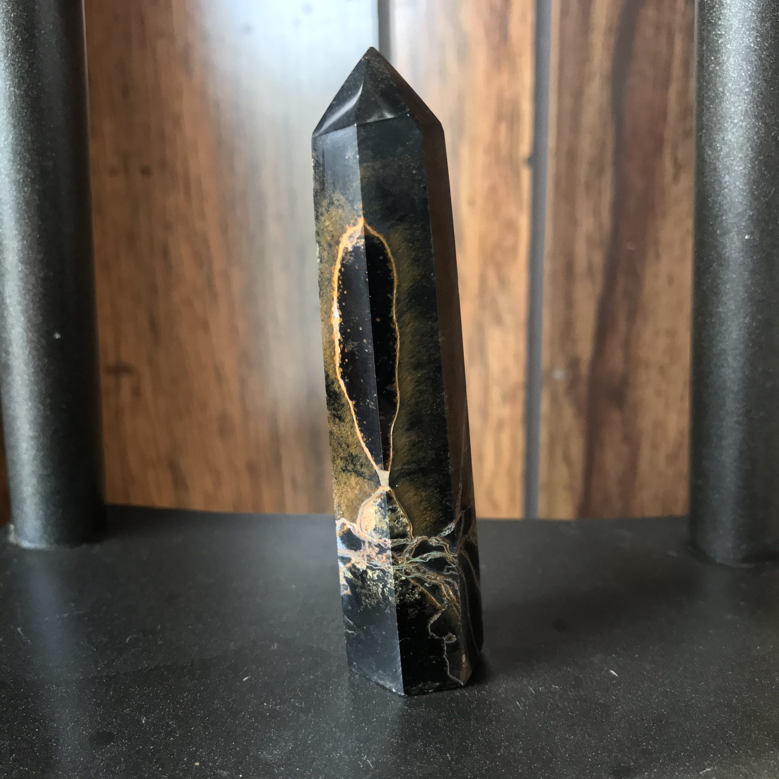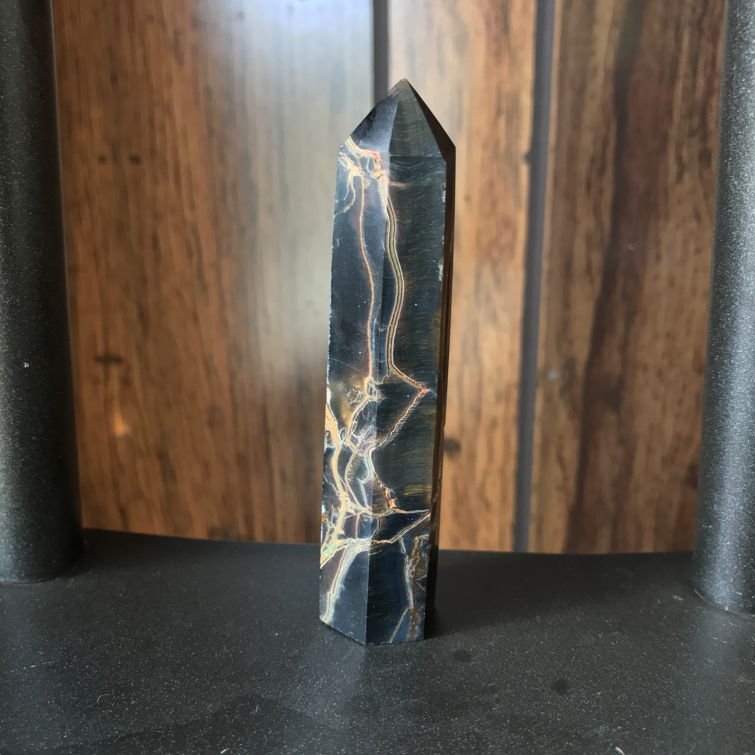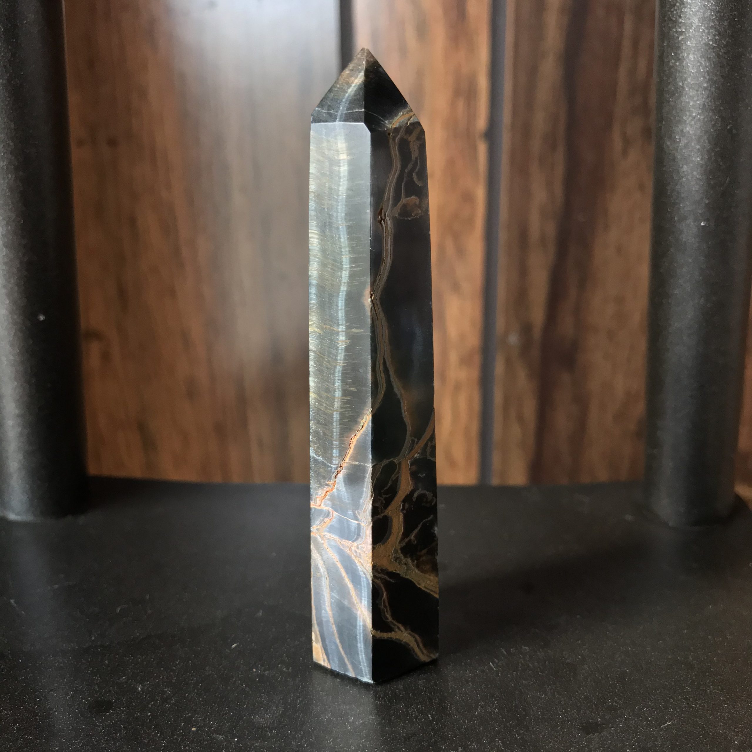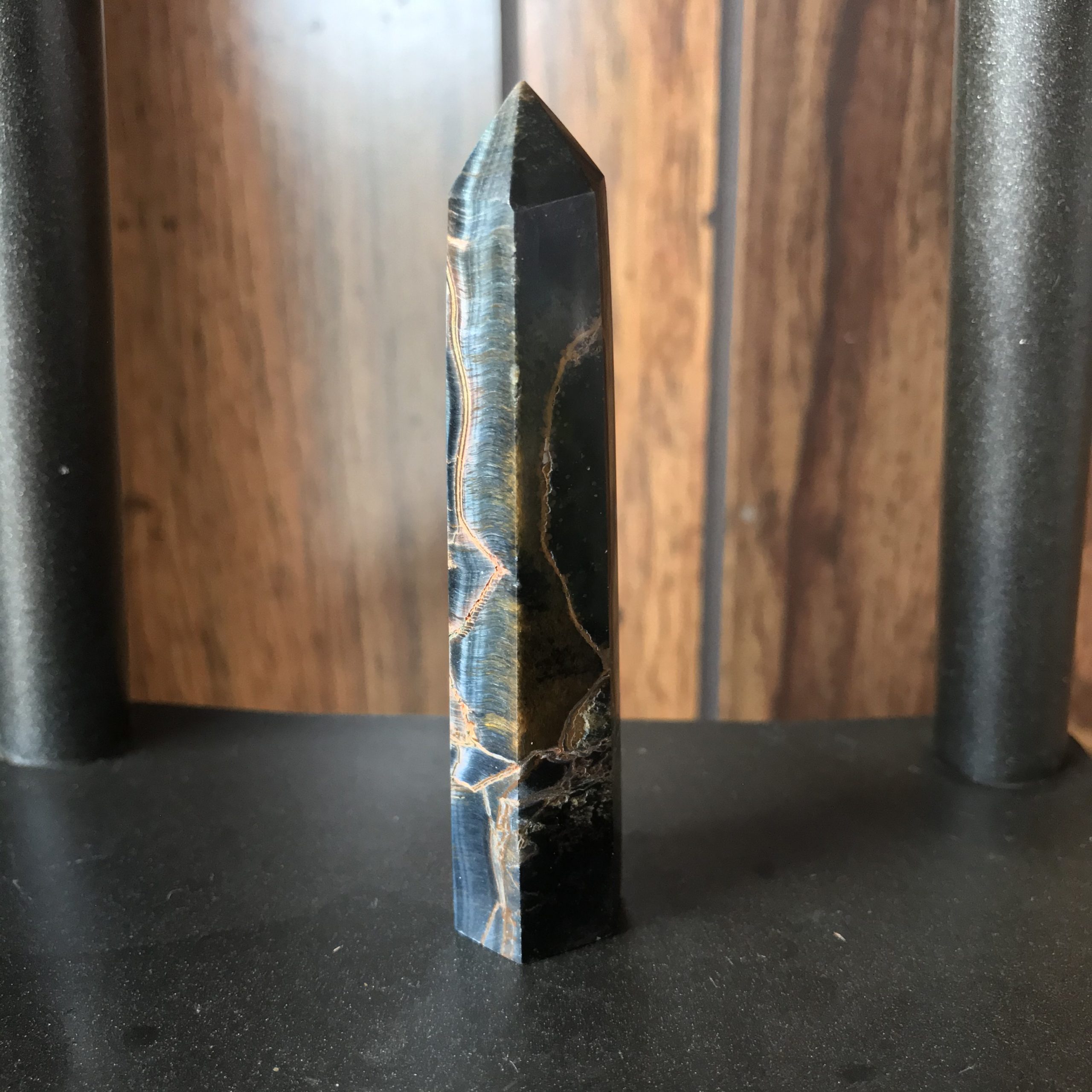 Tower is a dark blue almost black tigers eye has marbling of gold tigers eye and hematite. It is 3 1/3inches tall, 1/2 inch wide at the base and weighs 48 grams or 1.6 oz. Blue tigers eye symbolizes courage, strength and willpower.