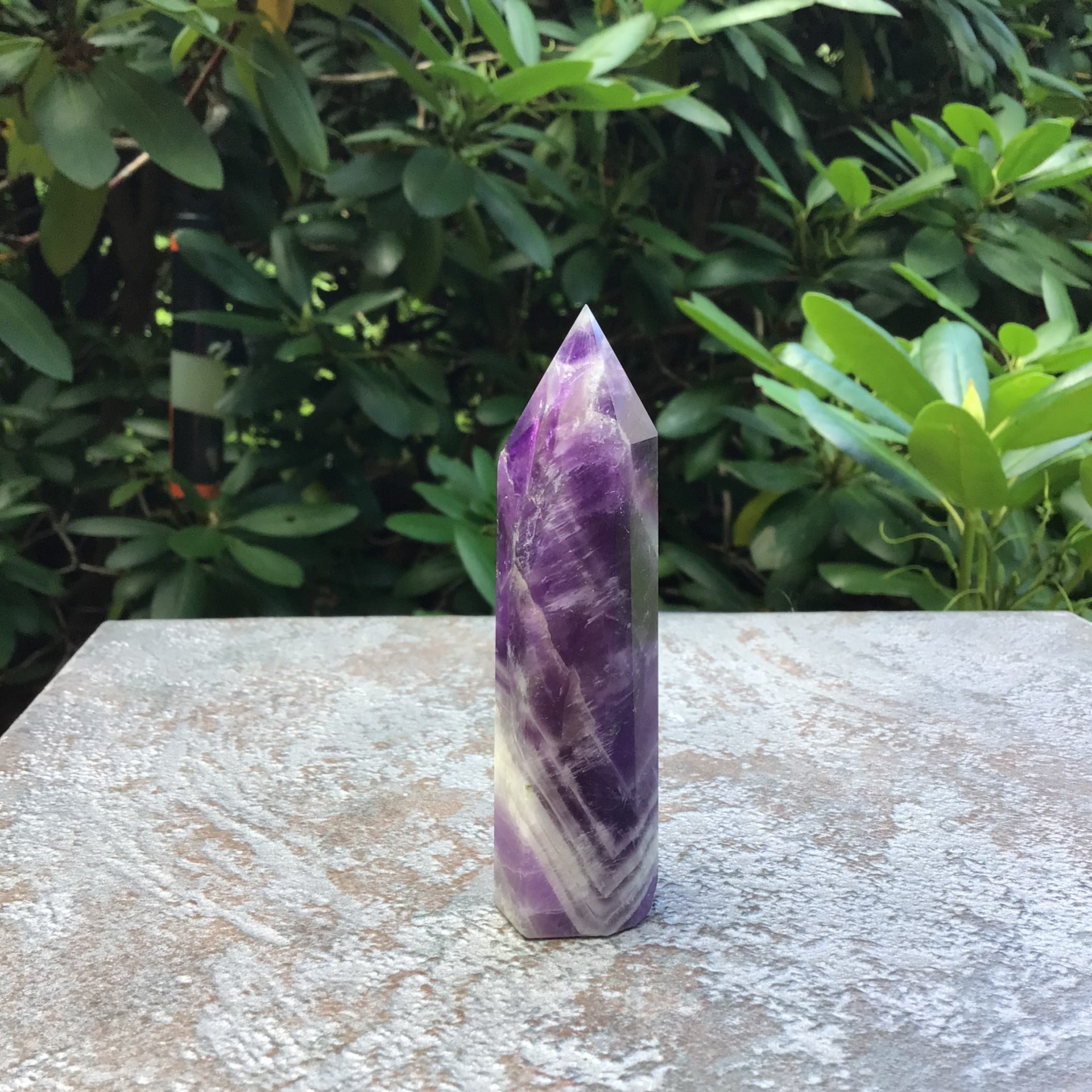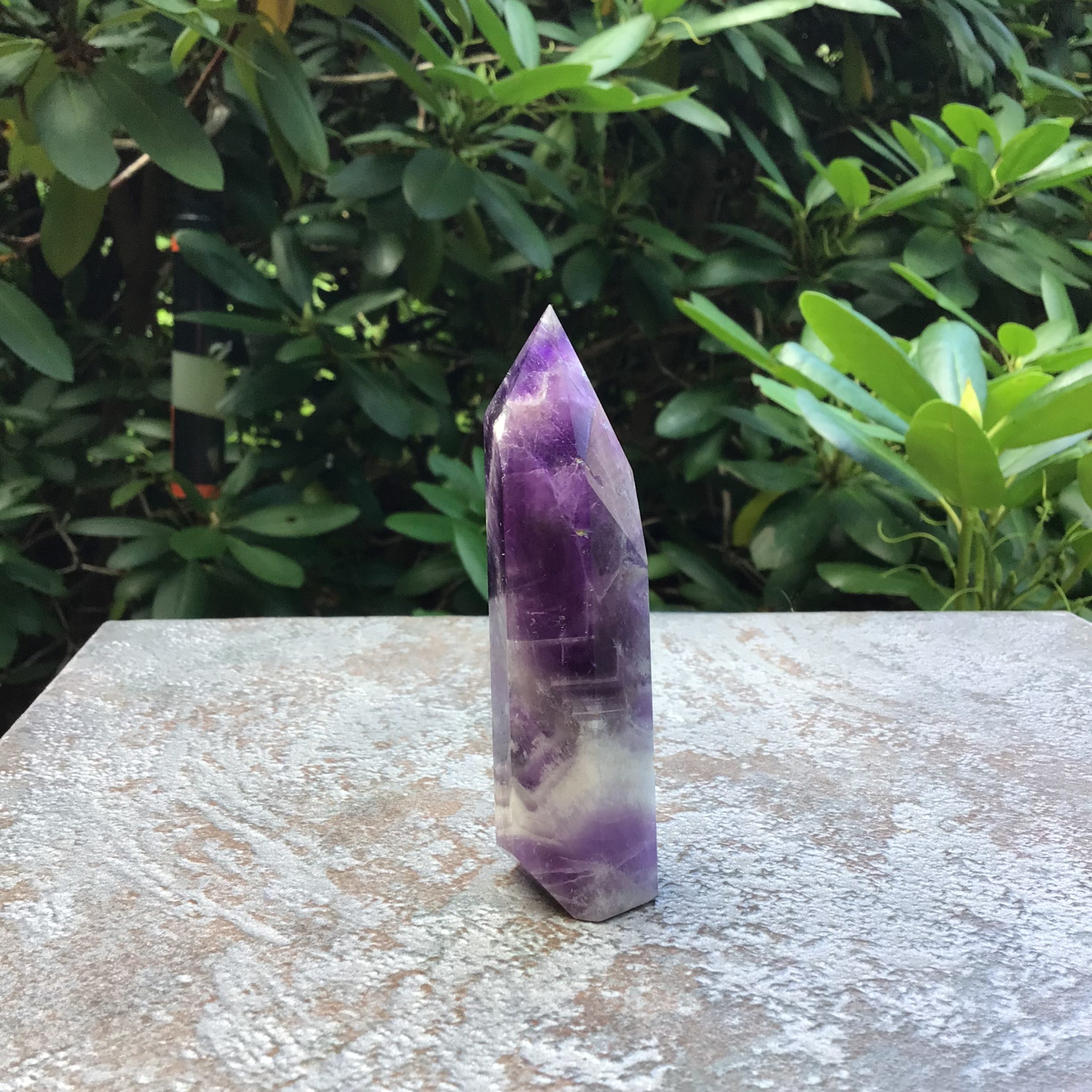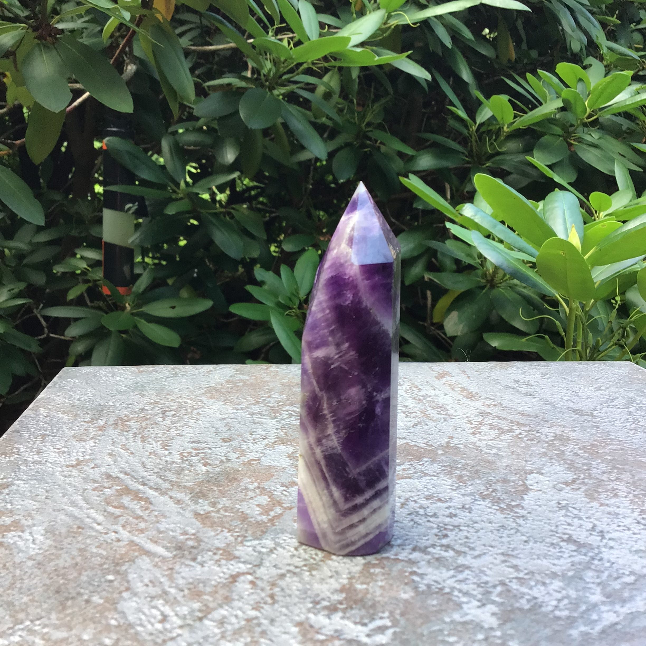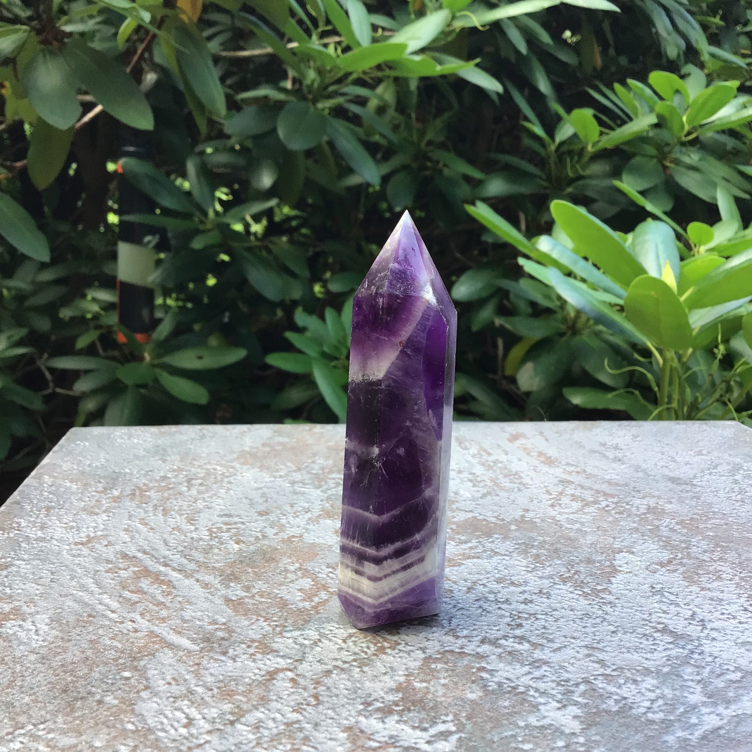 Tower is 3  3/4 inches tall, is 1 inch wide at the base and weighs 100 grams or 3.5 oz. Amethyst is a strong protective and healing stone with a powerful spiritual vibration. Also known as the Wisdom Stone, it helps settle the mind to find answers.