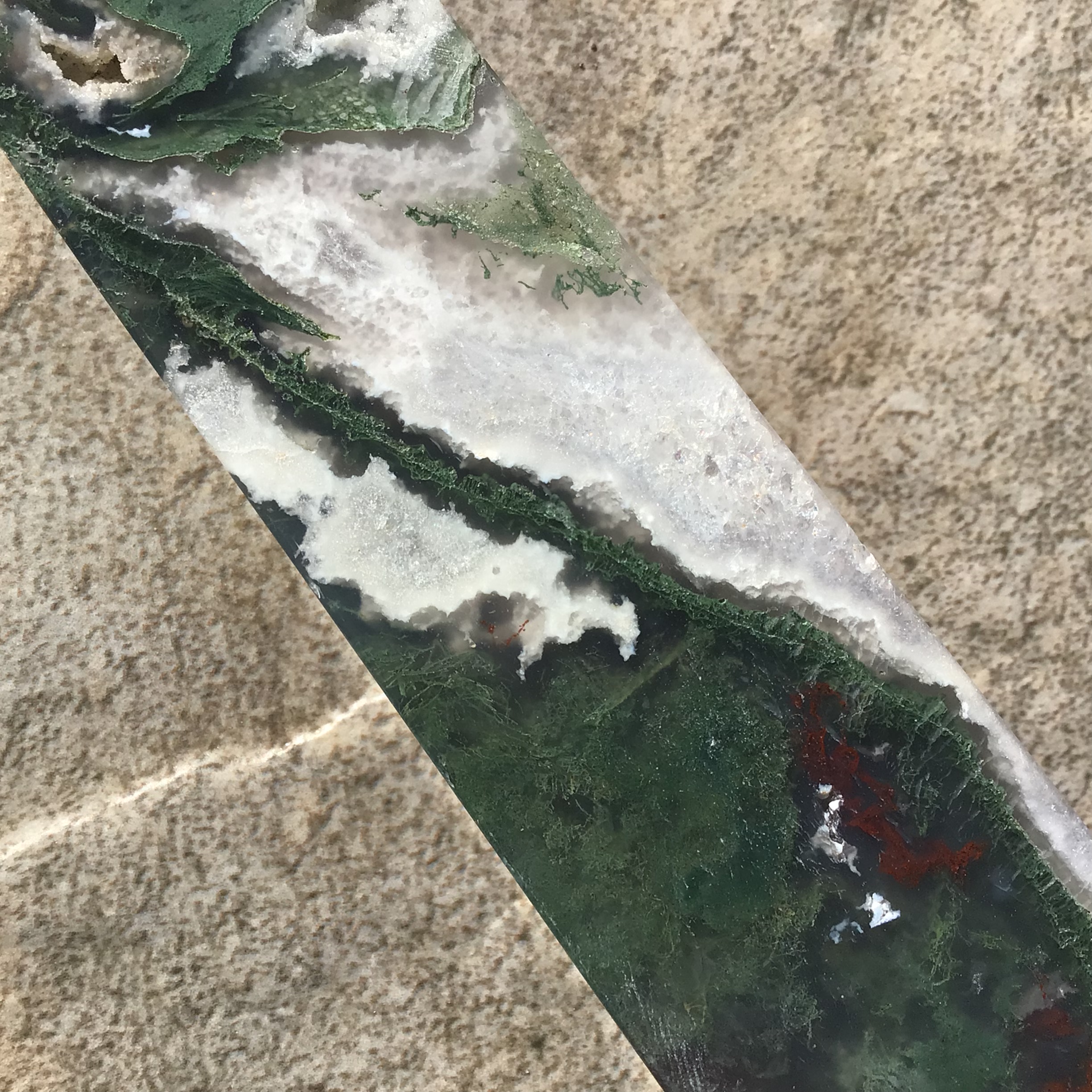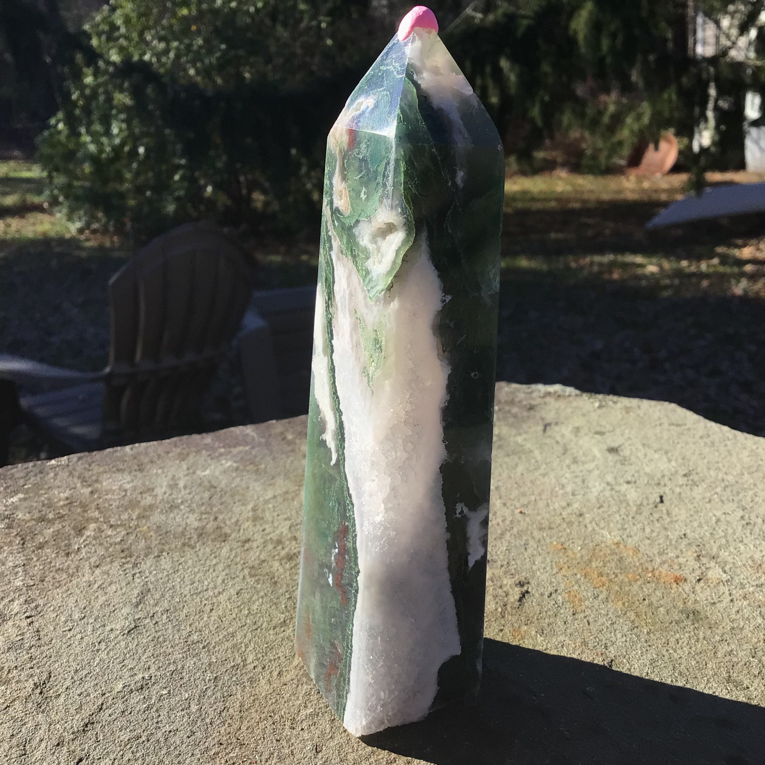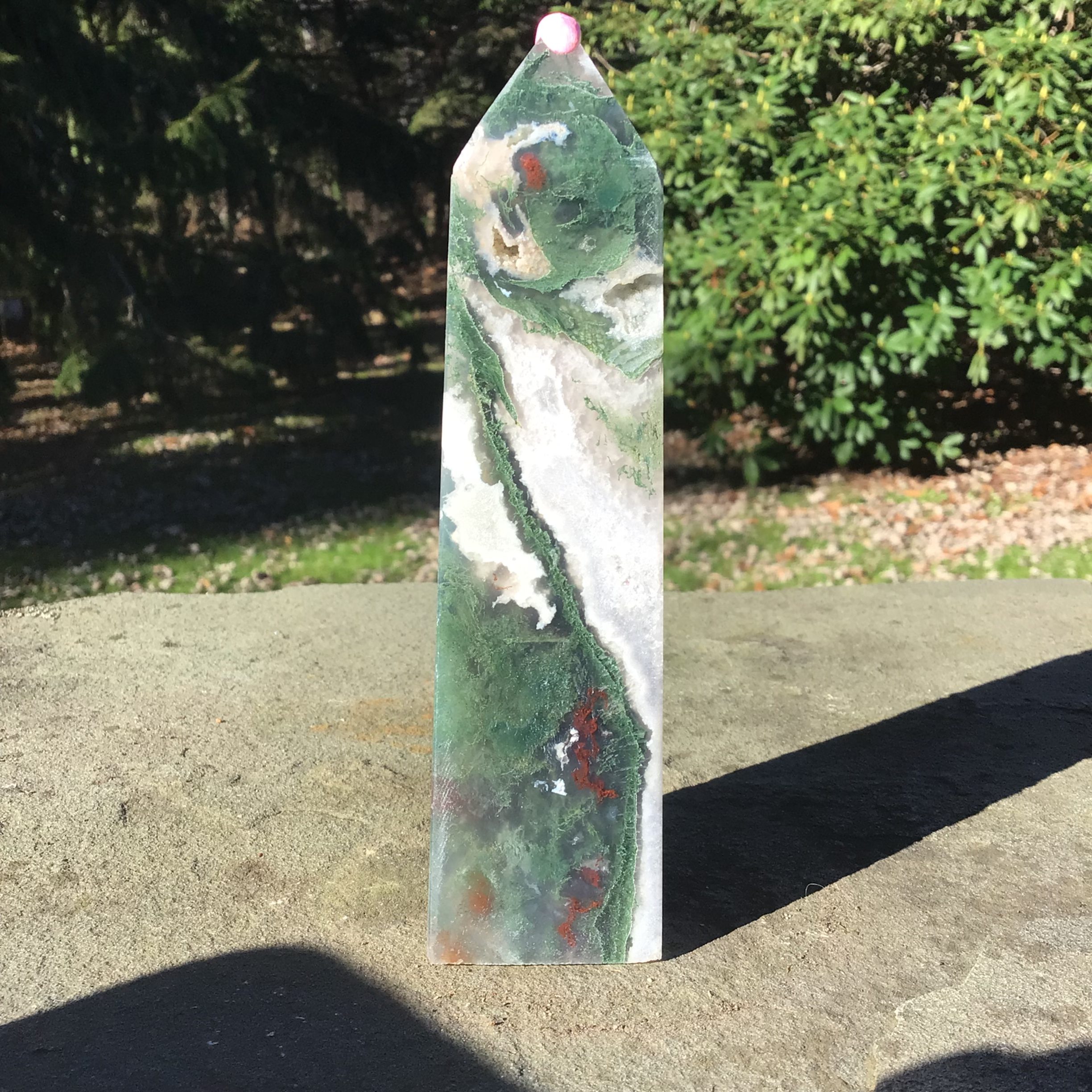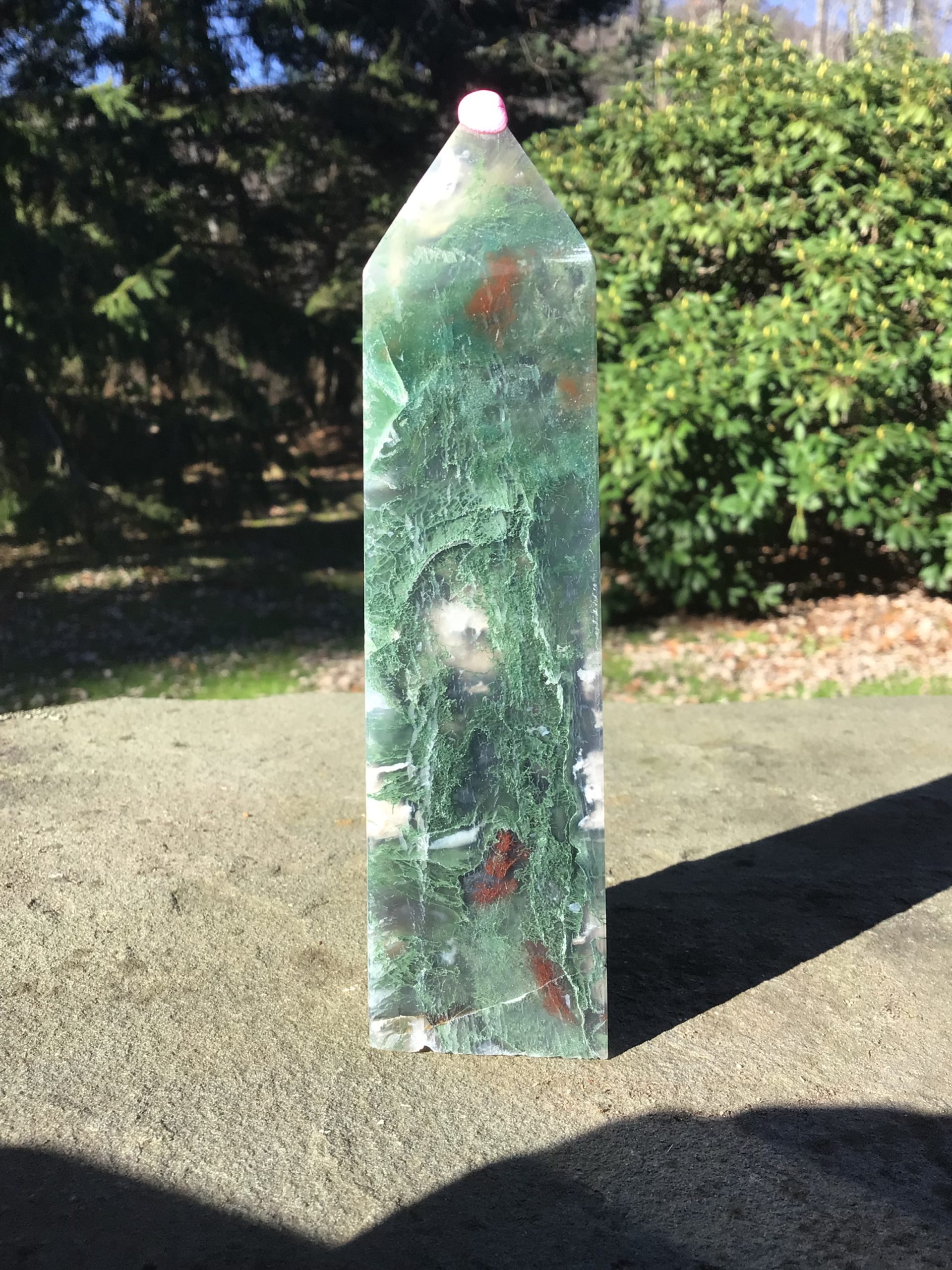 Beautiful quartz ripples through with splashes of deep red. Tower is 5 1/2 inches tall, is 1 1/2 inches wide at the base and weighs 304 grams or 10.7 oz. Moss agate is a stone that connects you to nature and brings abundance.