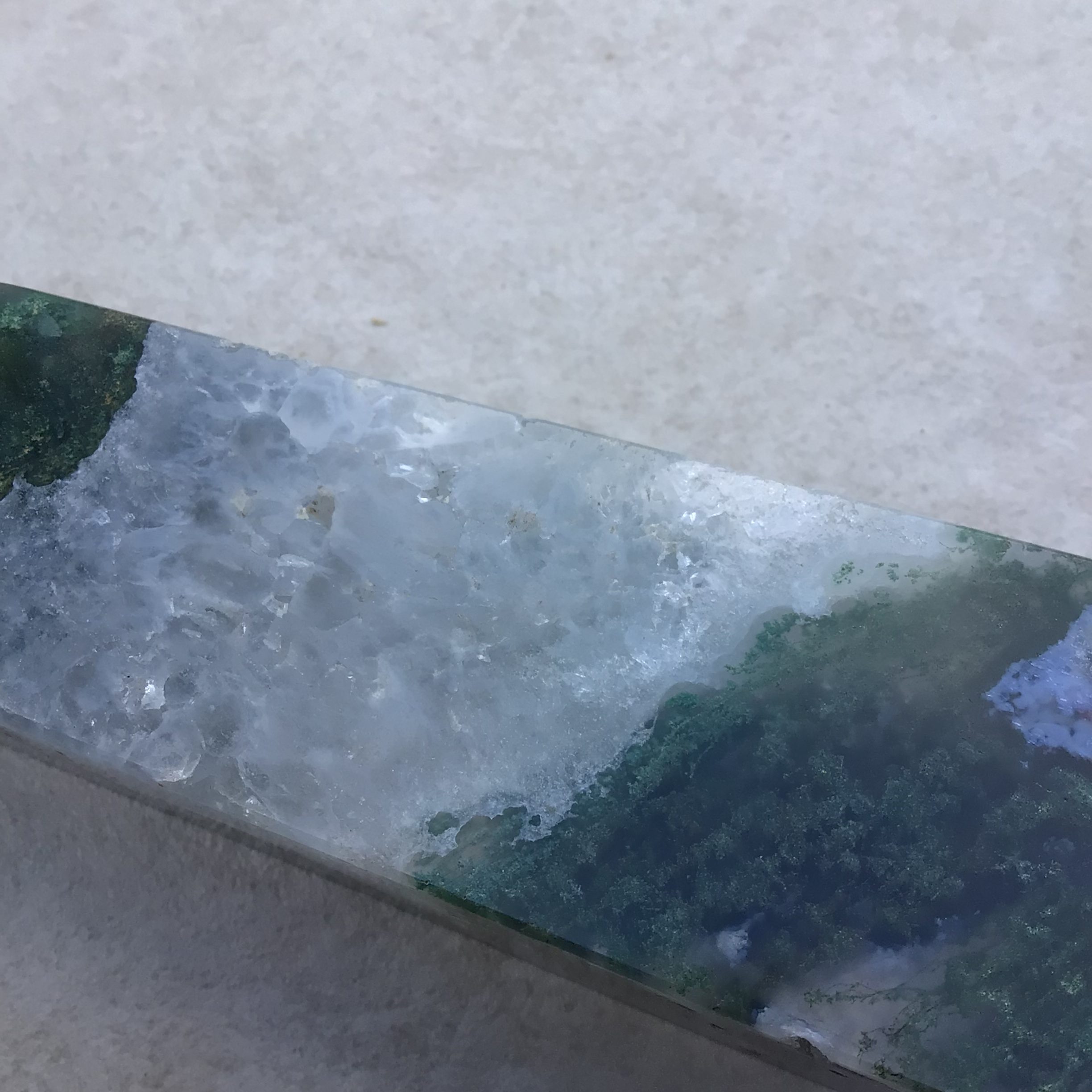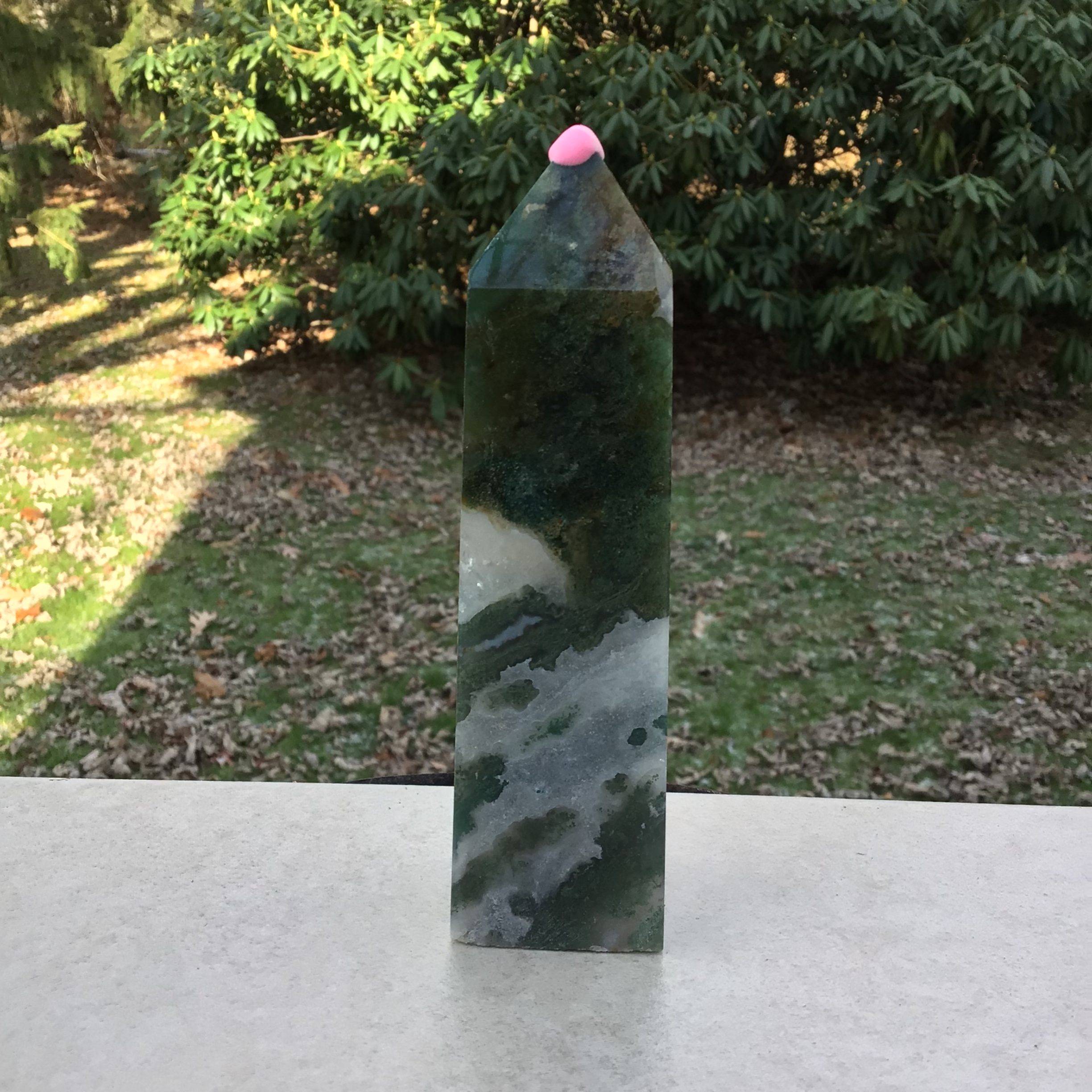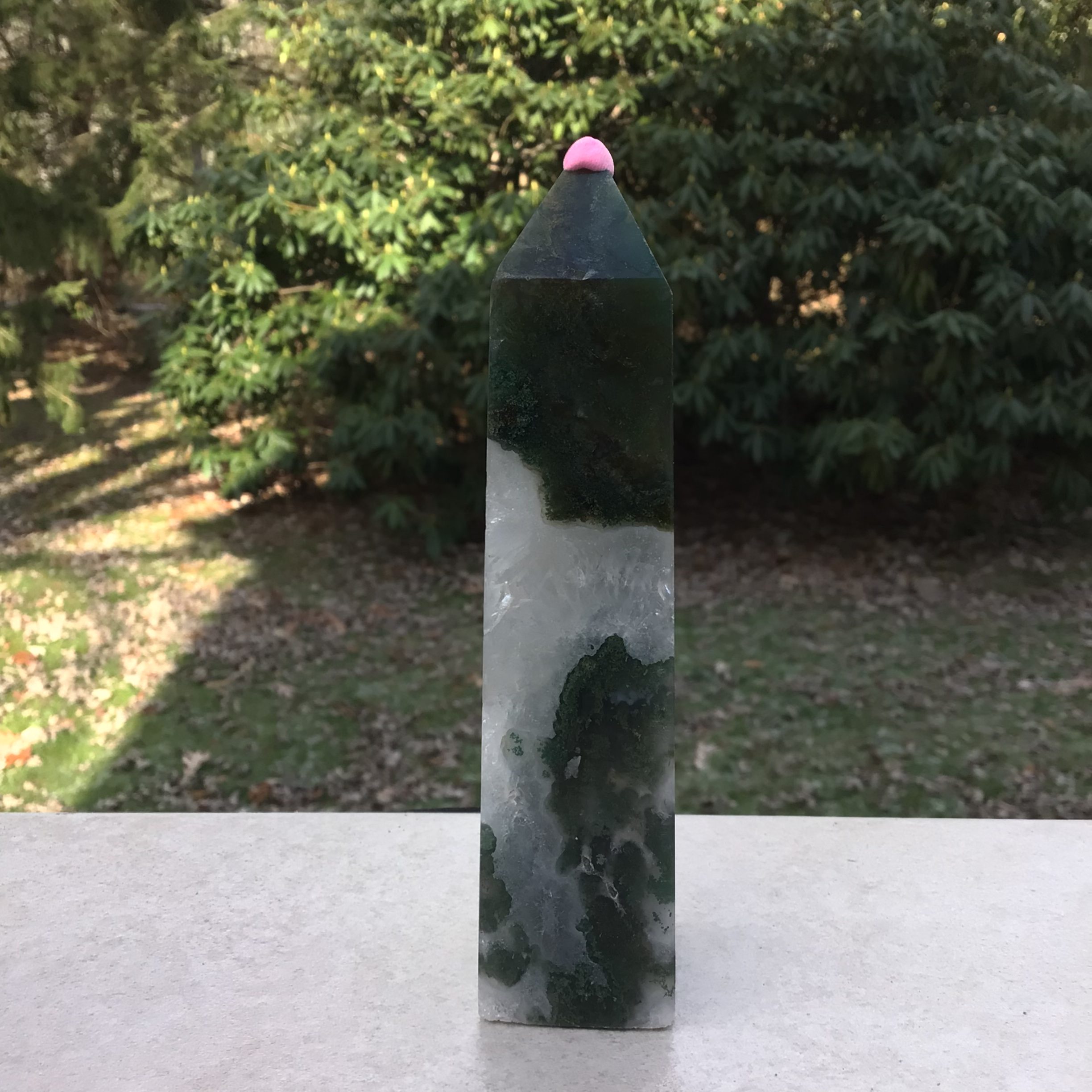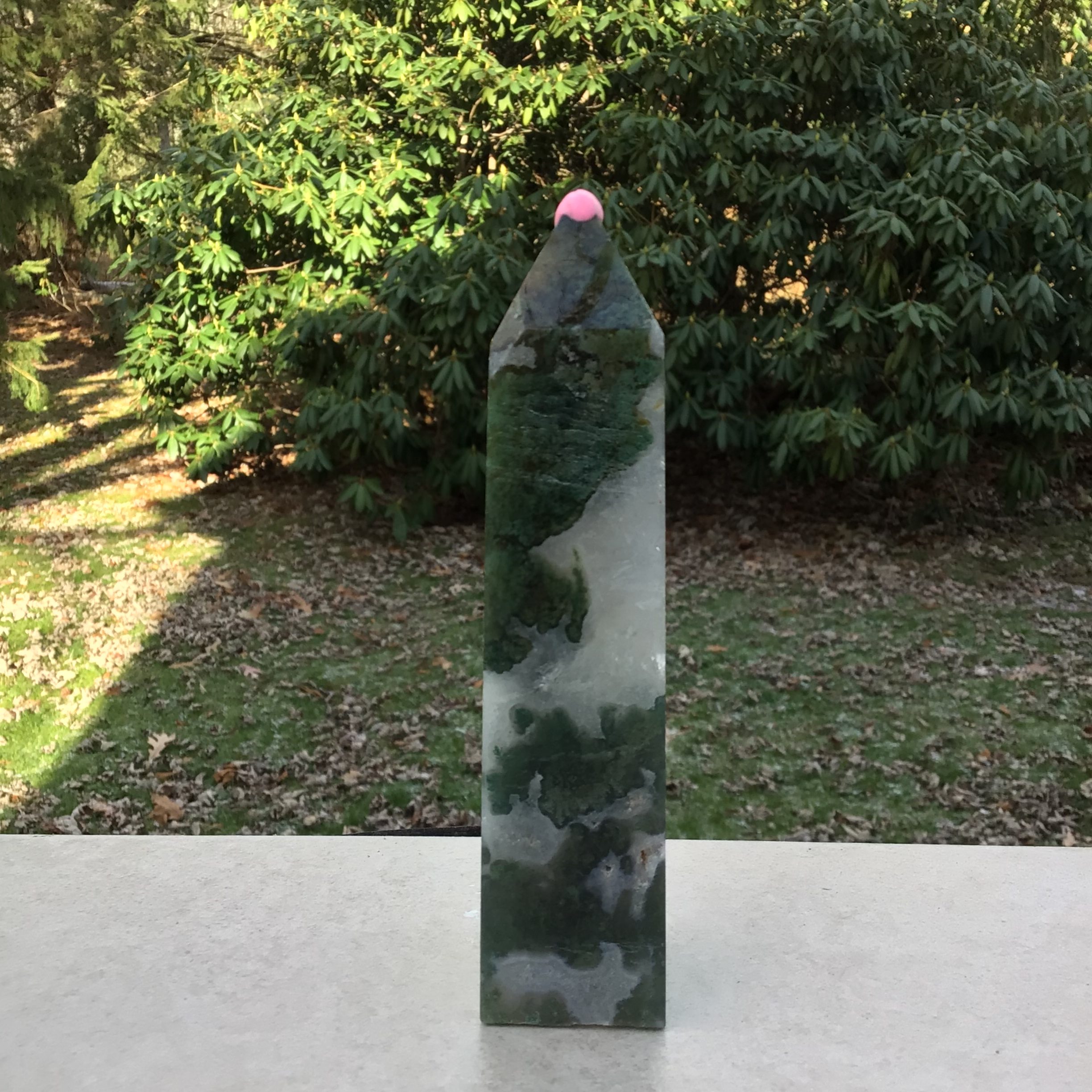 This tower has a beautiful quartz center. Tower is 5 1/2 inches tall,  is 1 1/2 inches wide at the base and weighs 314 grams or 11 oz. Moss agate is a stone that connects you to nature and brings abundance.
