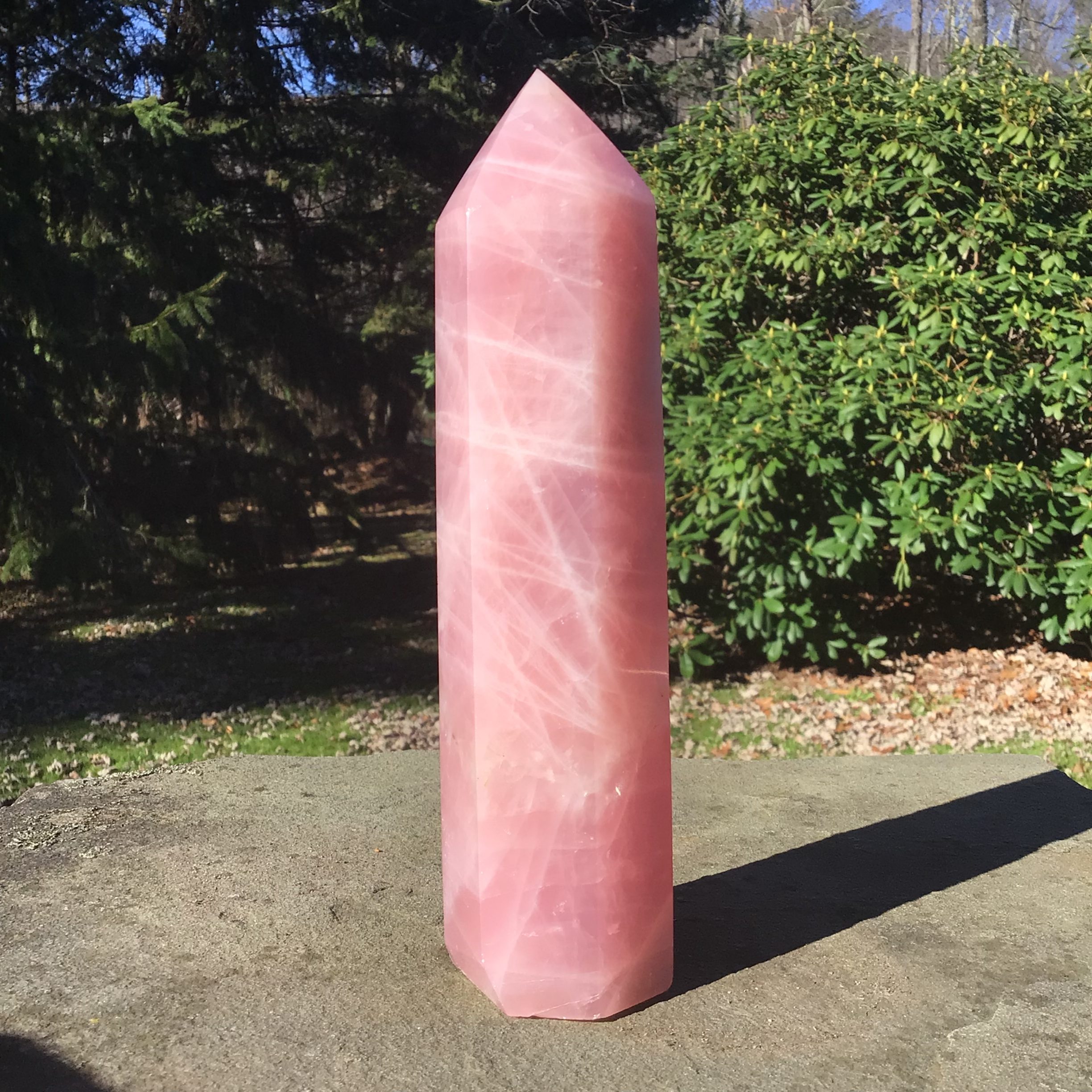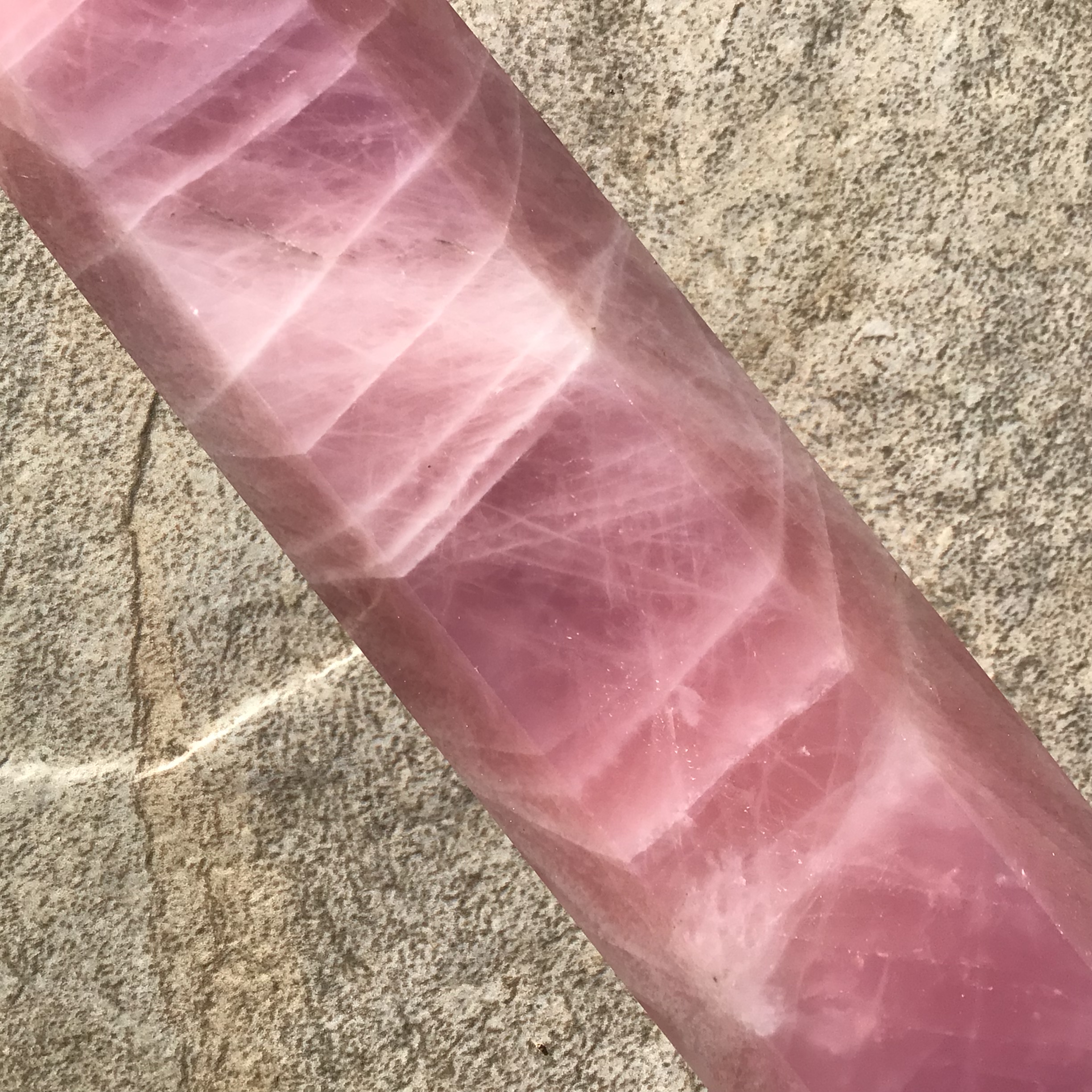 Deep pink colors marble through. Tower is 8 inches high, 2 inches at the base weighs 807 grams or 1lb. 12.4 oz. Stone of love.