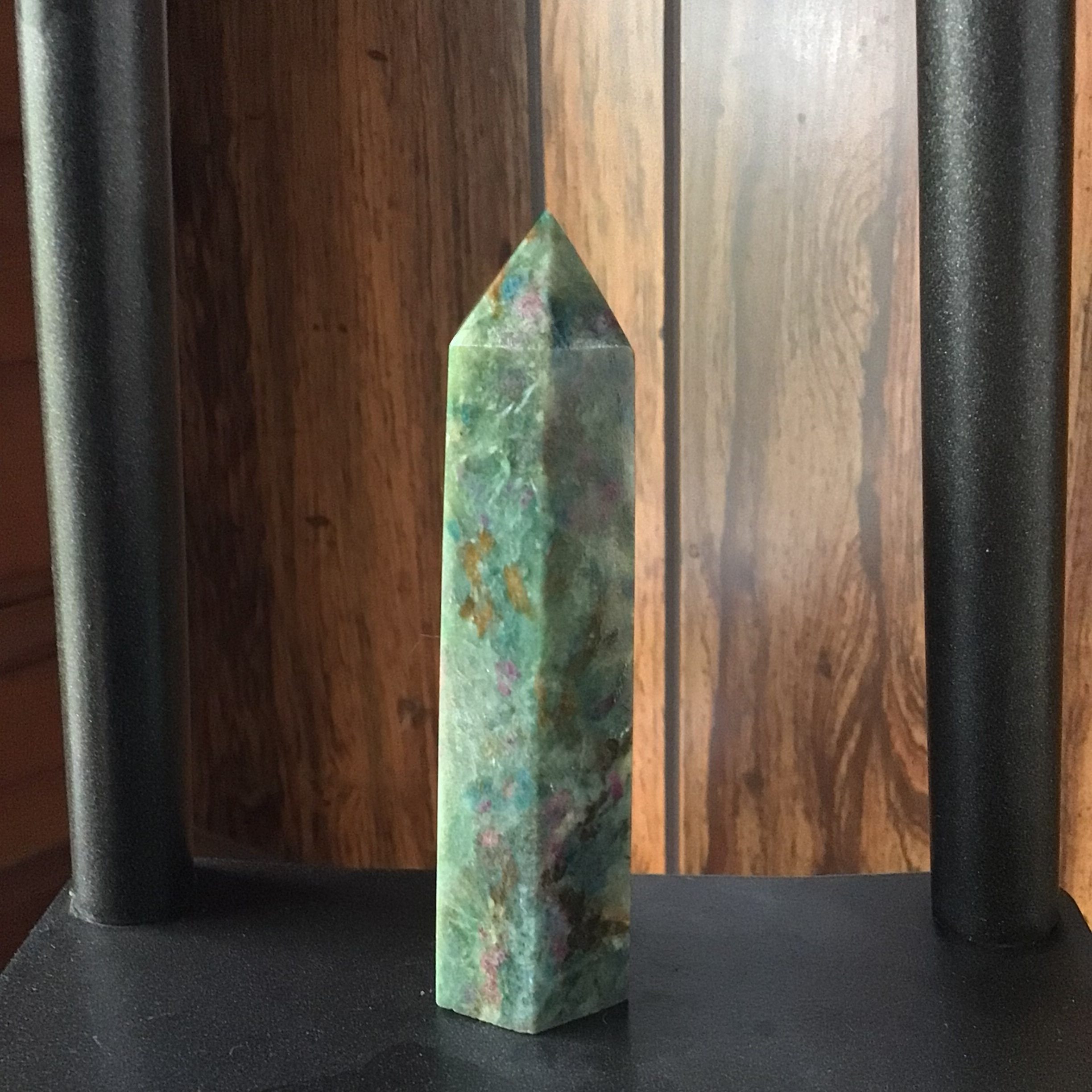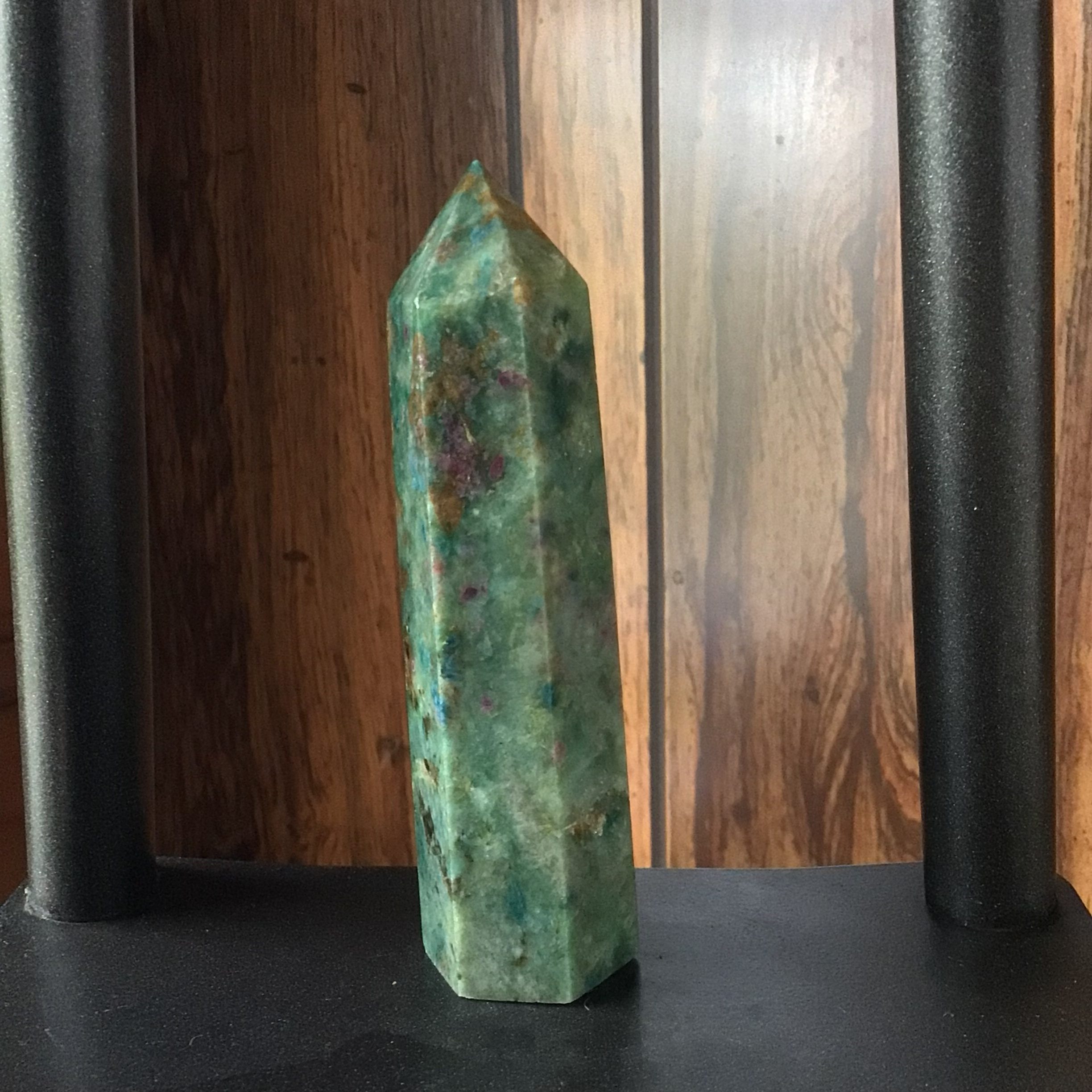 The combination stone of Ruby running through kyanite. Tower is 4 inches tall, 1 inch wide at the base and weighs 125 grams or 4.4 oz. Ruby in kyanite is a nurturing stone that will increase courage, passion and strength.