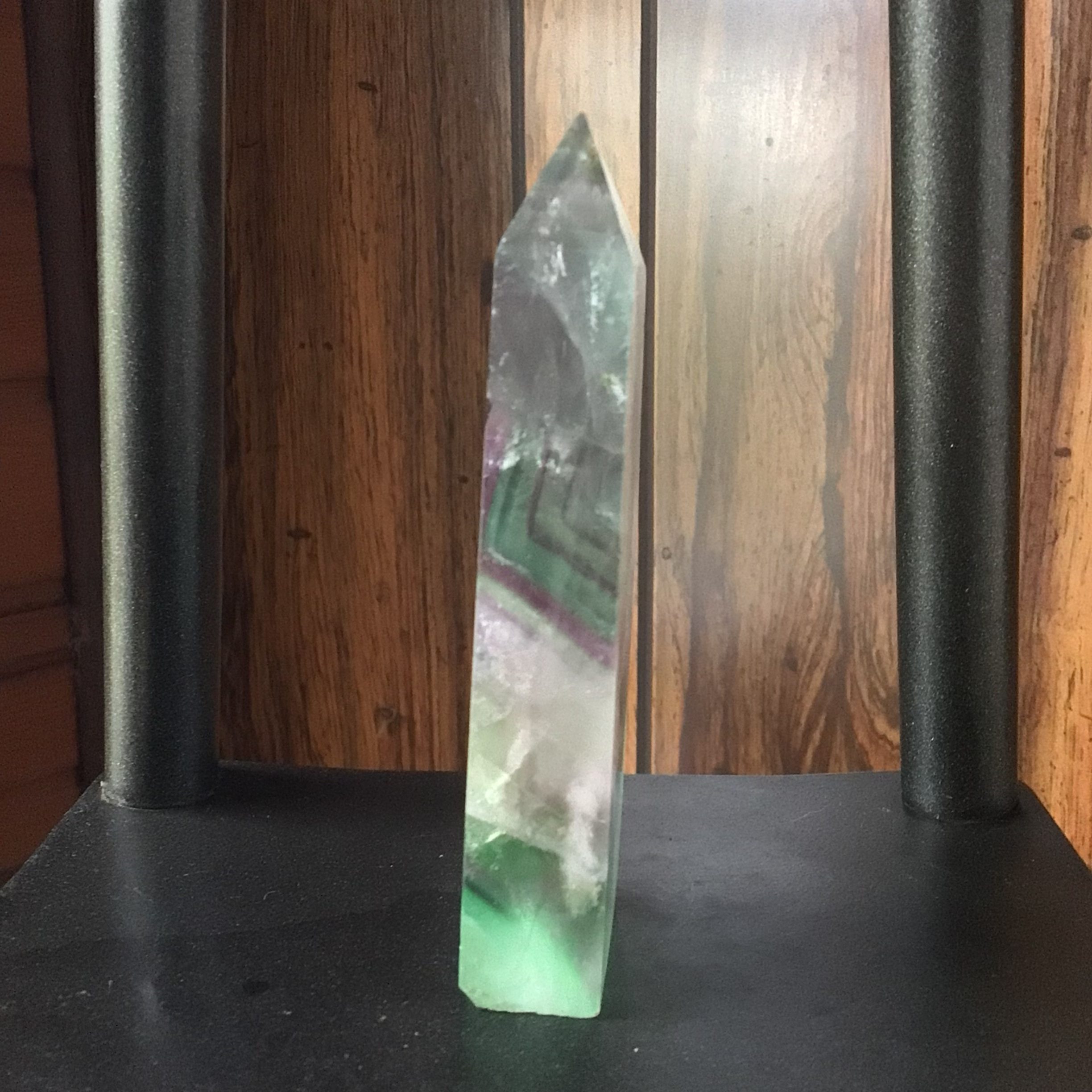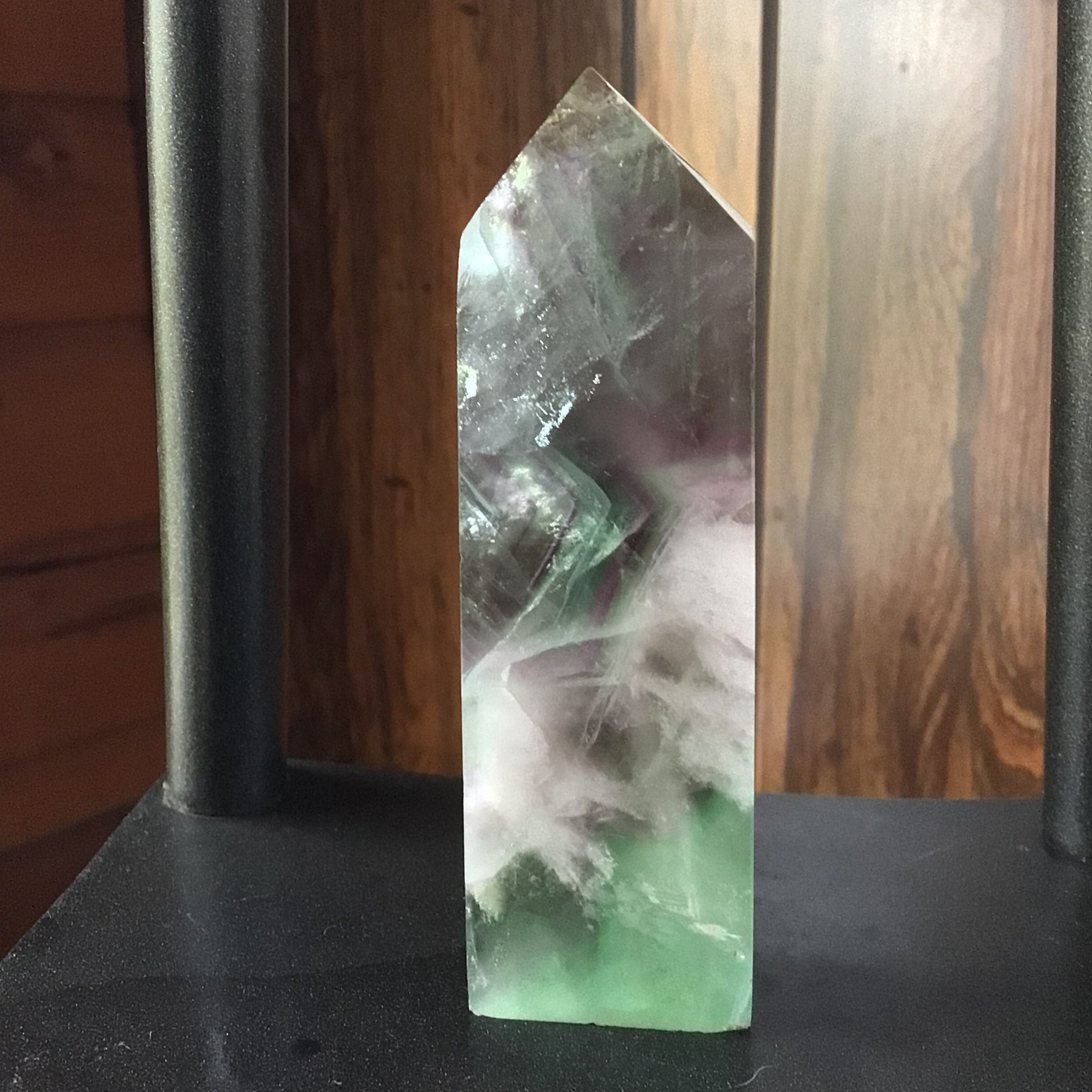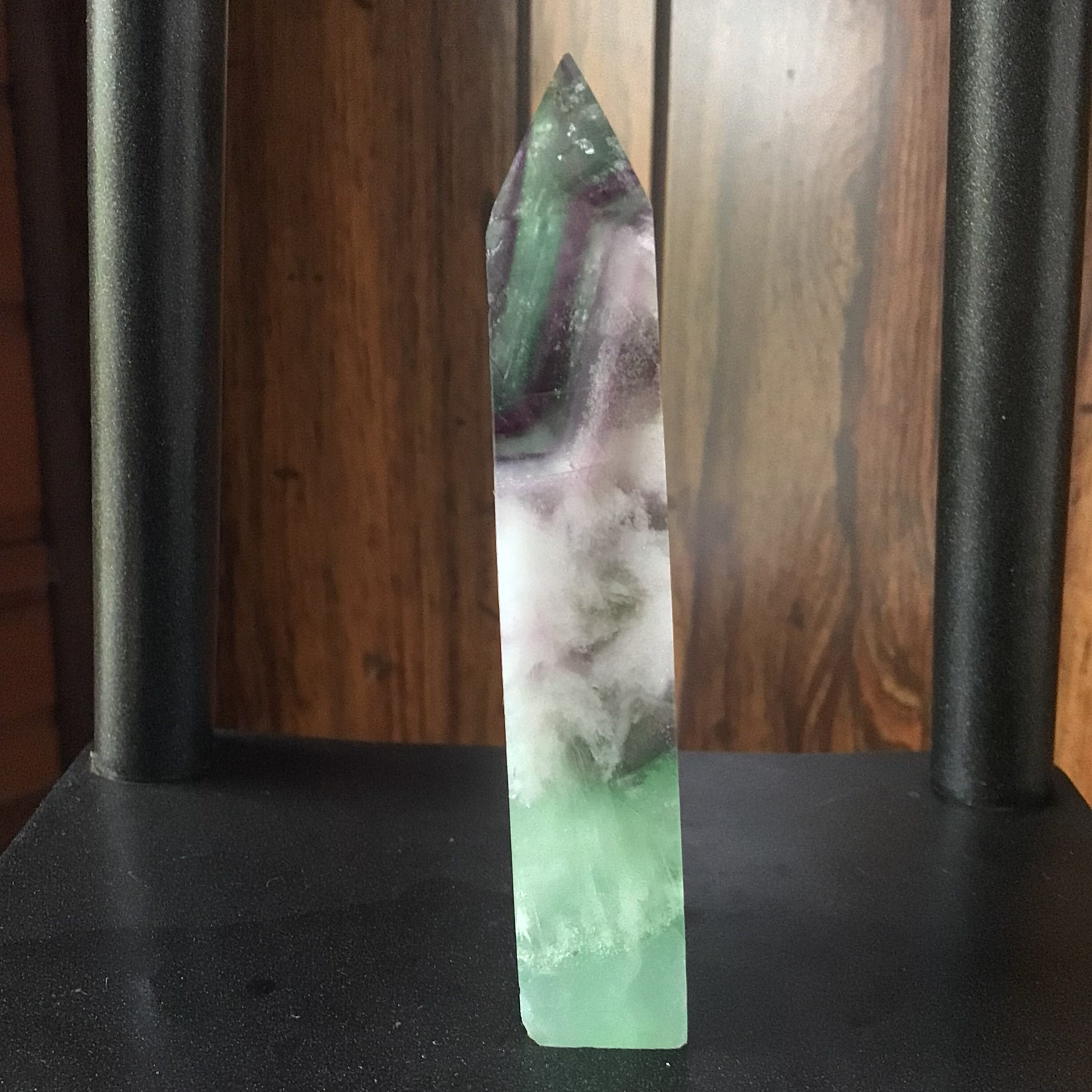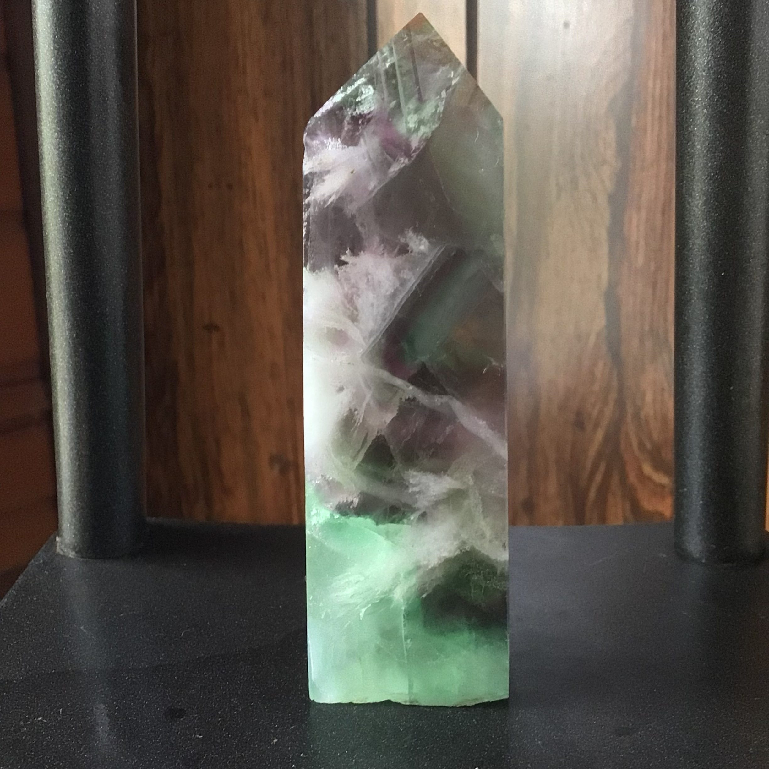 Flaky white inclusions (snowflake) runs through this tower. Tower is 4 inches tall, 1 1/4  wide at the base and weighs 133 grams or 4.5 oz. Fluoride is a protective stone, gives you mental clarity and balance.