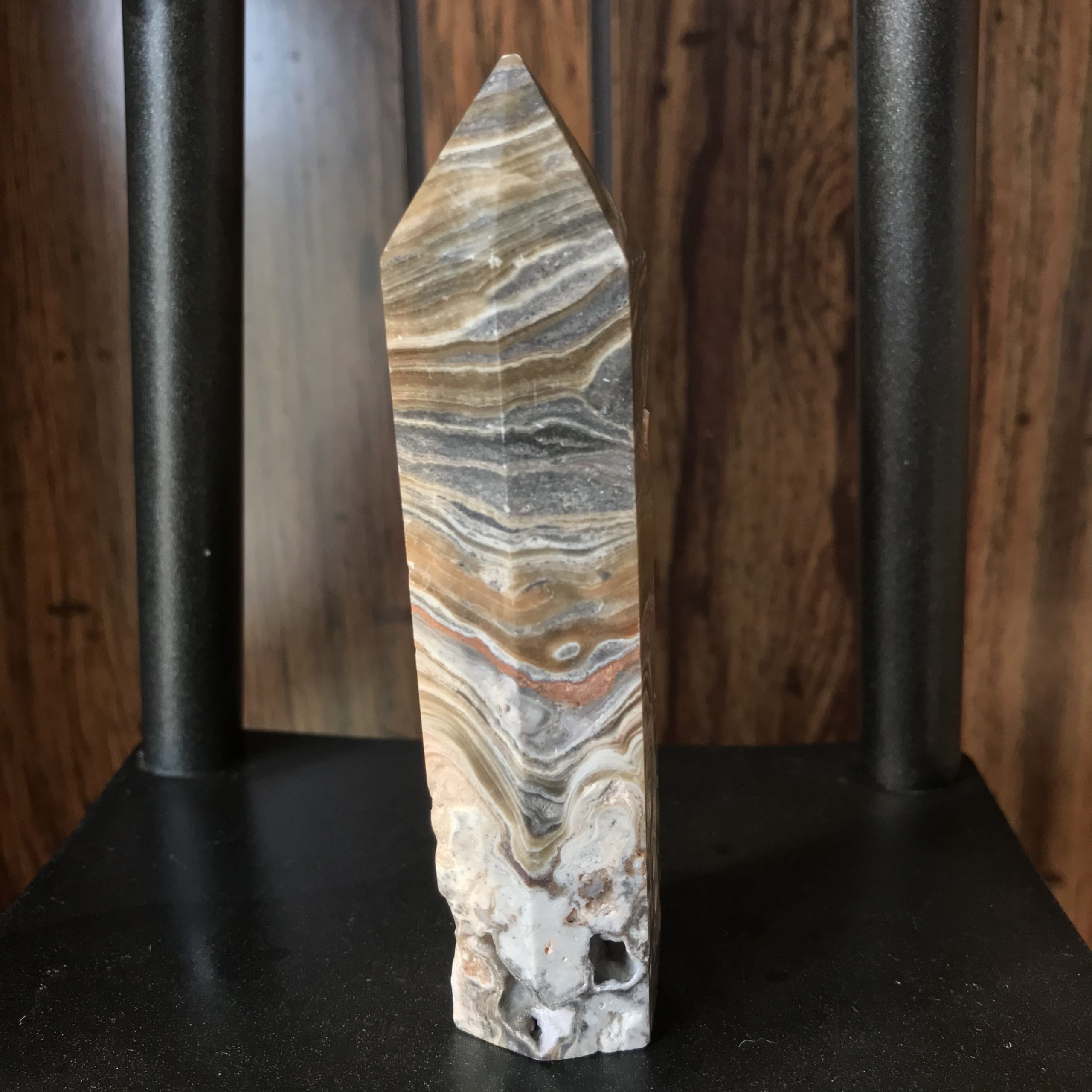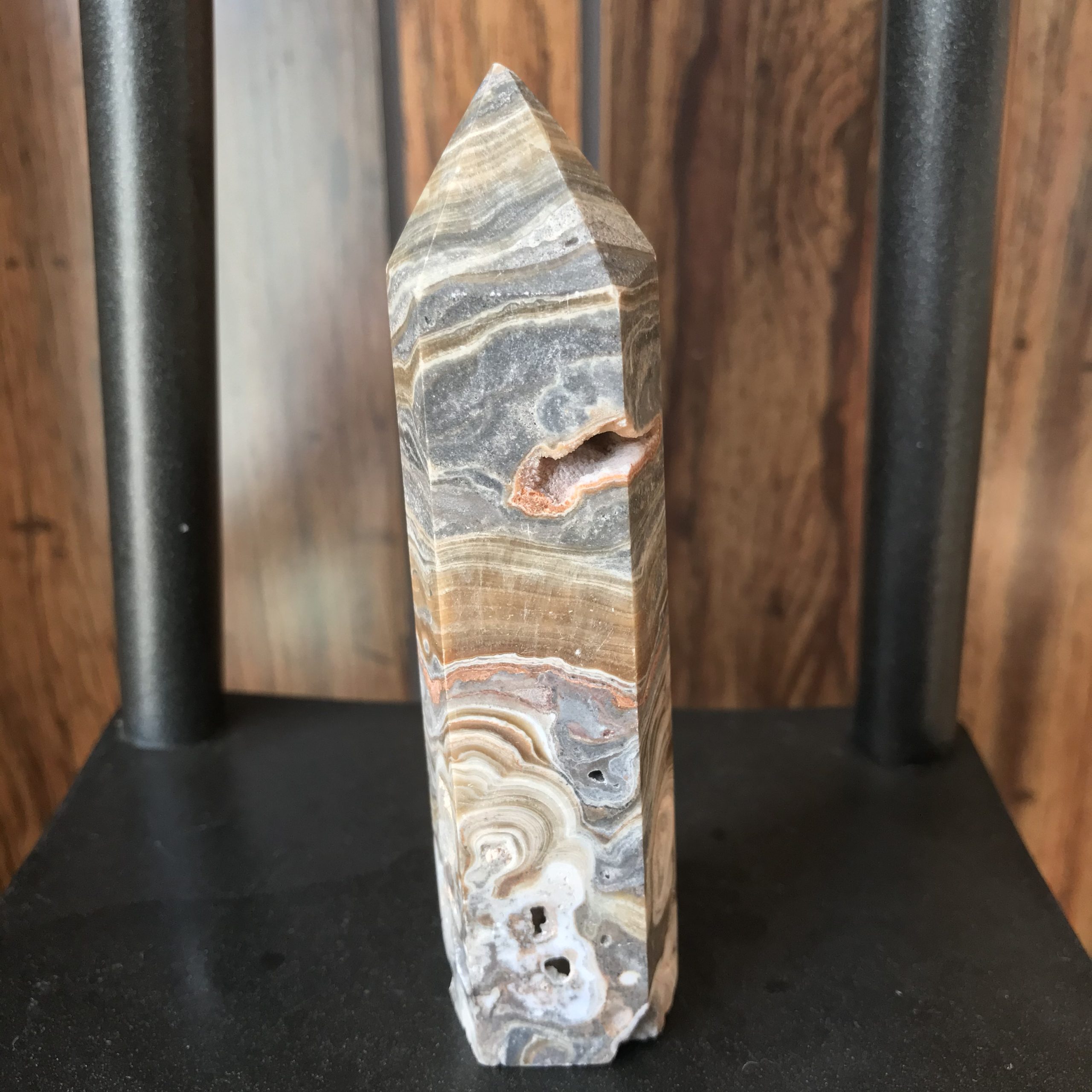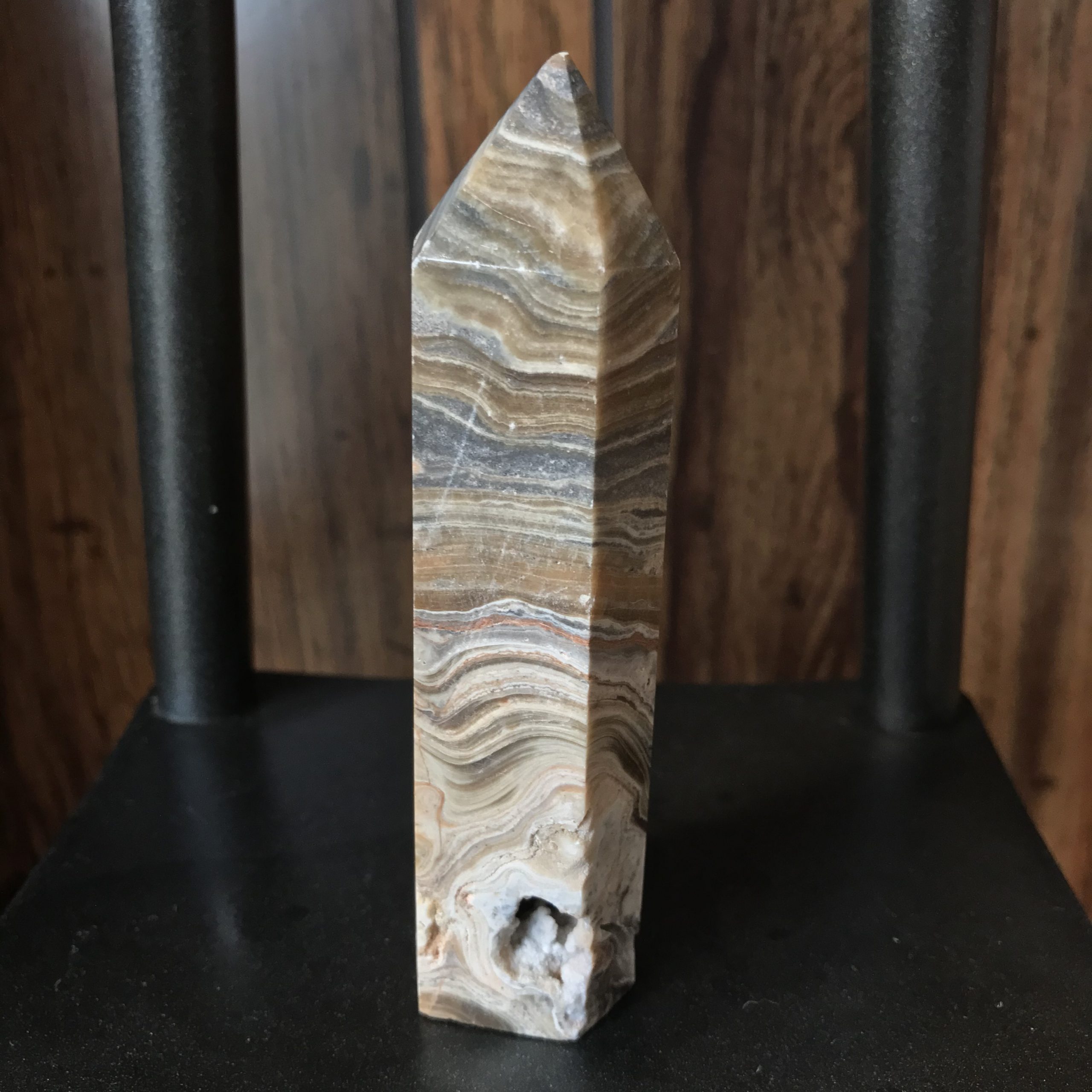 Tower has a few small pockets. It is 4 1/2 inches tall, 1 1/4 inch wide at the base and weighs 143 grams or 5 oz. Striped agate is a nurturing stone good for dissolving melancholy energy and whisking away negativity.